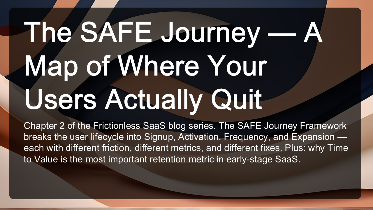 Chapter 2 of the Frictionless SaaS blog series. The SAFE Journey Framework breaks the user lifecycle into Signup, Activation, Frequency, and Expansion — each with different friction, different metrics, and different fixes. Plus: why Time to Value is the most important retention metric in early-stage SaaS.