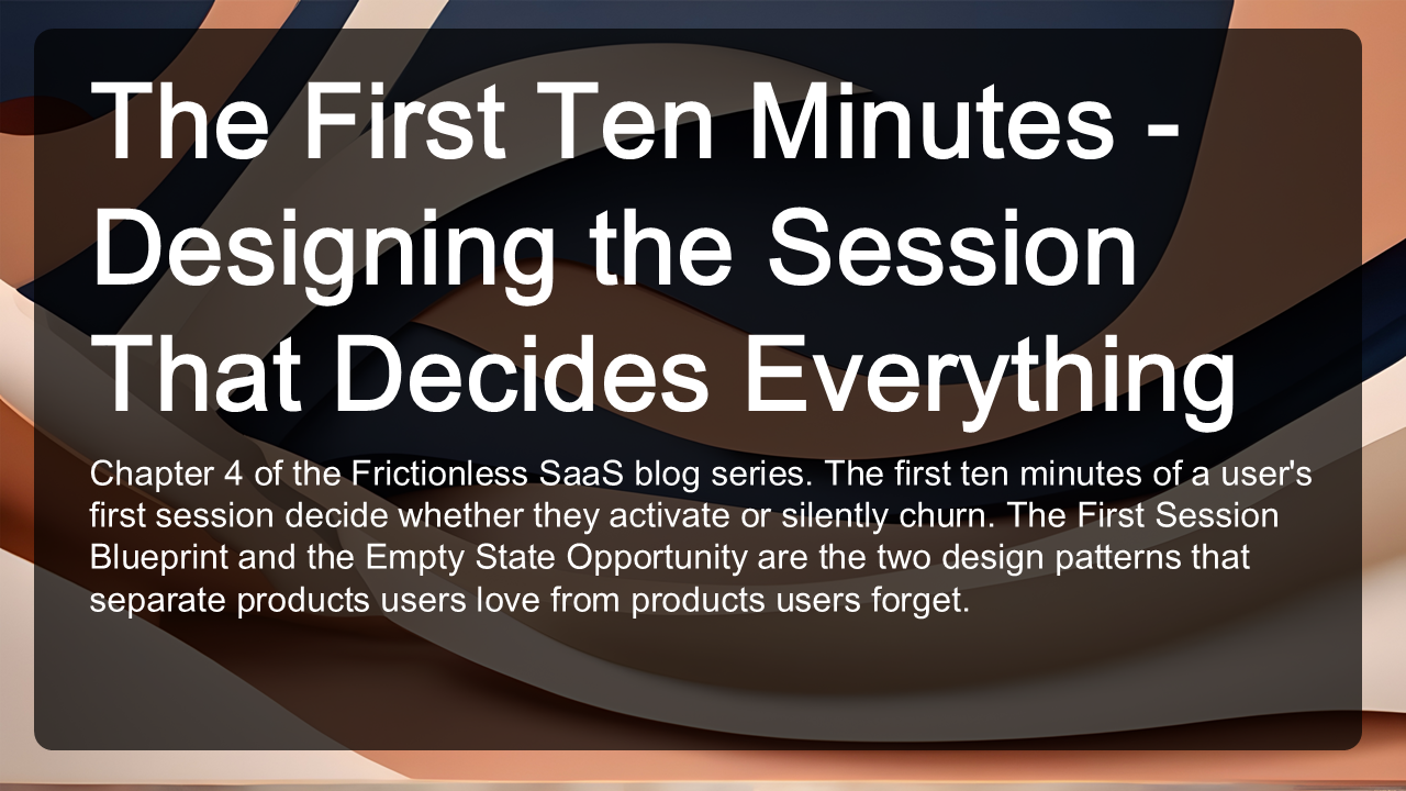Chapter 4 of the Frictionless SaaS blog series. The first ten minutes of a user's first session decide whether they activate or silently churn. The First Session Blueprint and the Empty State Opportunity are the two design patterns that separate products users love from products users forget.