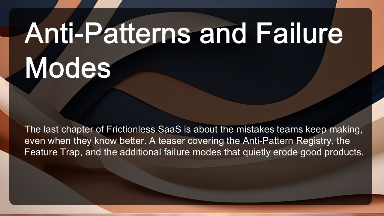 The last chapter of Frictionless SaaS is about the mistakes teams keep making, even when they know better. A teaser covering the Anti-Pattern Registry, the Feature Trap, and the additional failure modes that quietly erode good products.