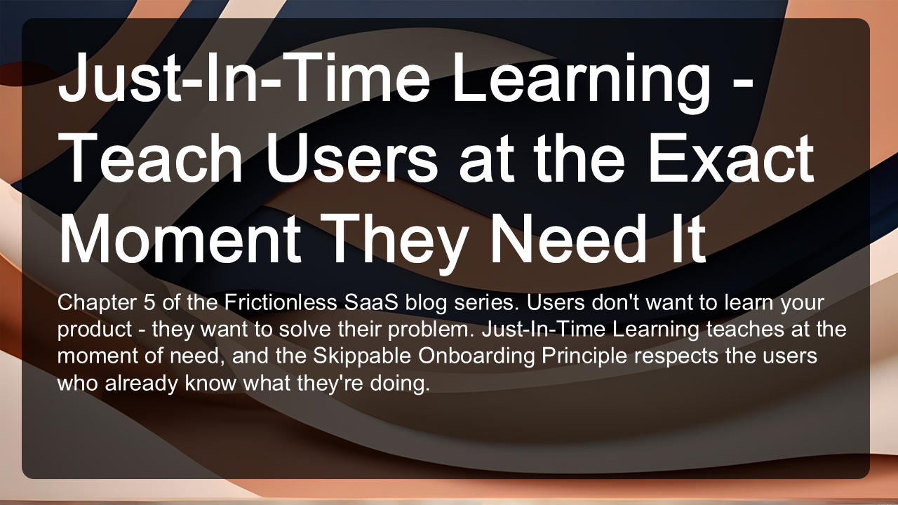 Chapter 5 of the Frictionless SaaS blog series. Users don't want to learn your product - they want to solve their problem. Just-In-Time Learning teaches at the moment of need, and the Skippable Onboarding Principle respects the users who already know what they're doing.