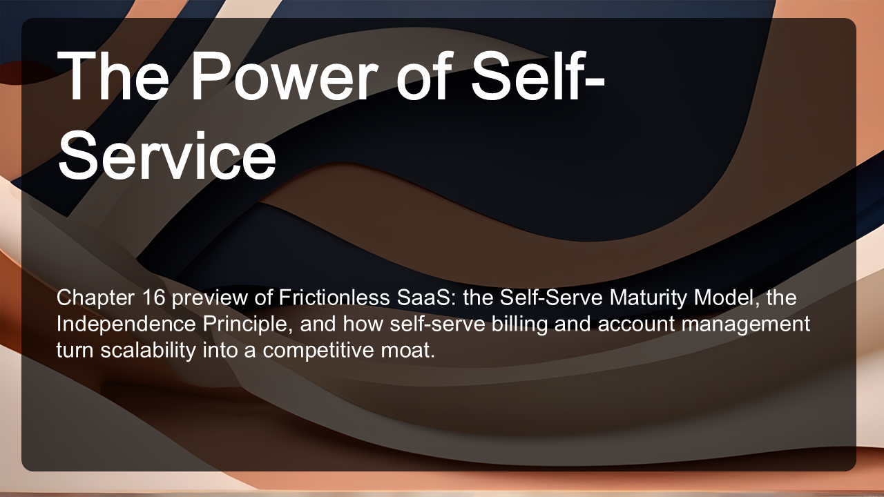 Chapter 16 preview of Frictionless SaaS: the Self-Serve Maturity Model, the Independence Principle, and how self-serve billing and account management turn scalability into a competitive moat.