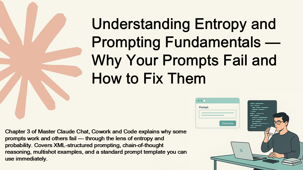 Chapter 3 of Master Claude Chat, Cowork and Code explains why some prompts work and others fail — through the lens of entropy and probability. Covers XML-structured prompting, chain-of-thought reasoning, multishot examples, and a standard prompt template you can use immediately.