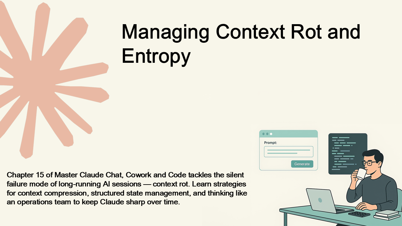 Chapter 15 of Master Claude Chat, Cowork and Code tackles the silent failure mode of long-running AI sessions — context rot. Learn strategies for context compression, structured state management, and thinking like an operations team to keep Claude sharp over time.