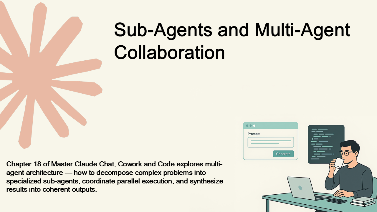Chapter 18 of Master Claude Chat, Cowork and Code explores multi-agent architecture — how to decompose complex problems into specialized sub-agents, coordinate parallel execution, and synthesize results into coherent outputs.