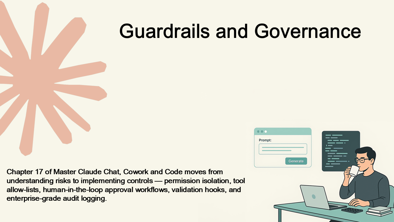 Chapter 17 of Master Claude Chat, Cowork and Code moves from understanding risks to implementing controls — permission isolation, tool allow-lists, human-in-the-loop approval workflows, validation hooks, and enterprise-grade audit logging.