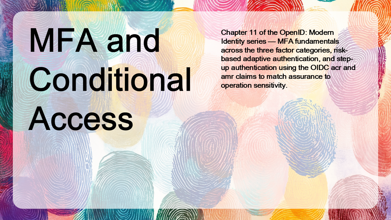 Chapter 11 of the OpenID: Modern Identity series — MFA fundamentals across the three factor categories, risk-based adaptive authentication, and step-up authentication using the OIDC acr and amr claims to match assurance to operation sensitivity.