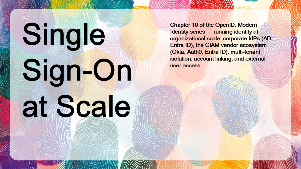 Chapter 10 of the OpenID: Modern Identity series — running identity at organizational scale: corporate IdPs (AD, Entra ID), the CIAM vendor ecosystem (Okta, Auth0, Entra ID), multi-tenant isolation, account linking, and external user access.