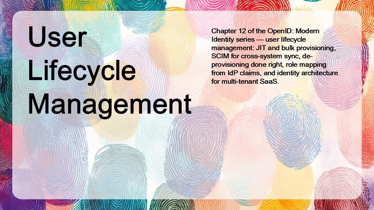 Chapter 12 of the OpenID: Modern Identity series — user lifecycle management: JIT and bulk provisioning, SCIM for cross-system sync, de-provisioning done right, role mapping from IdP claims, and identity architecture for multi-tenant SaaS.