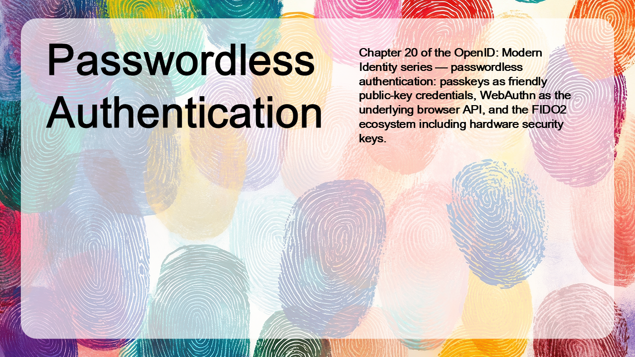 Chapter 20 of the OpenID: Modern Identity series — passwordless authentication: passkeys as friendly public-key credentials, WebAuthn as the underlying browser API, and the FIDO2 ecosystem including hardware security keys.