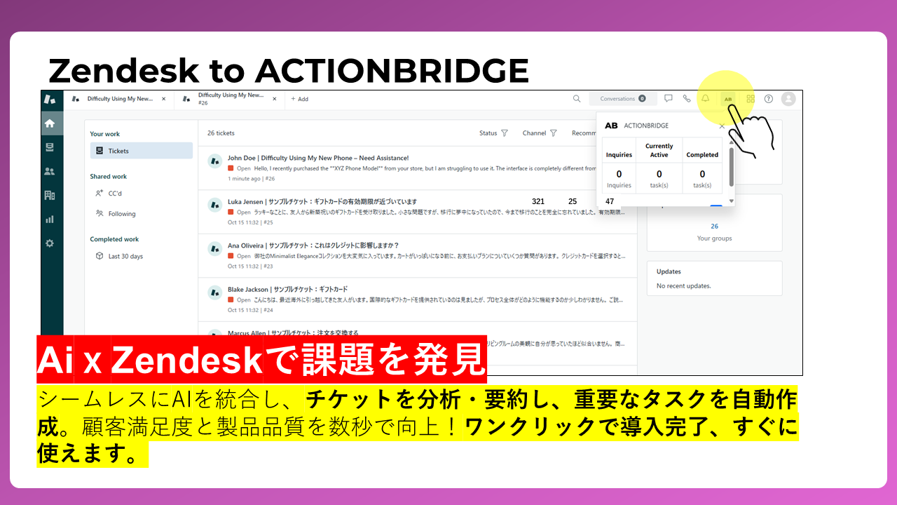 株式会社レシートローラー(本社:長野県上水内郡飯綱町|代表取締役CEO:下田昌平)は、「アクションブリッジZendesk Marketplaceアプリ」を正式にリリースしました。これにより、Zendesk上の問い合わせデータをAIが解析し、課題の特定から対応タスクの自動生成までを一元管理することが可能になります。